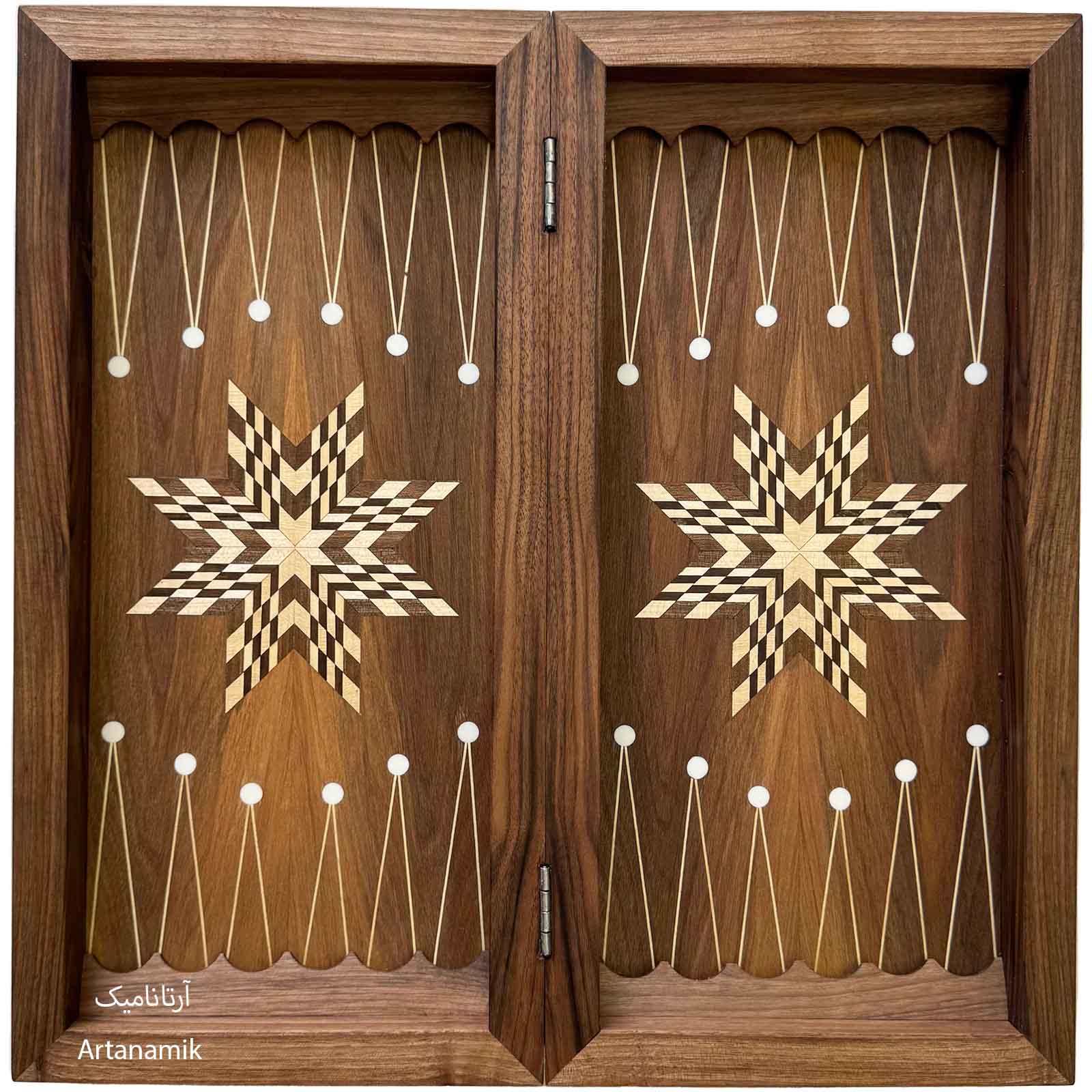 تخته نرد منبت کاری شده طرح فرشته عدالت، انتخابی نفیس و لوکس برای علاقهمندان به بازیهای سنتی و هنر اصیل ایرانی است. این محصول از چوب گردوی کاملاً خشک و باکیفیت ساخته شده که در برابر تغییرات رطوبتی و جابهجایی مقاوم بوده و مانع از تاببرداشتگی میشود. سطح تخته با منبت کاری ظریف و کاملاً دستساز تزئین شده و نقش فرشته عدالت در بیرون و در درون مارس هشتپر، جلوهای باشکوه و خاص به این اثر بخشیده است.