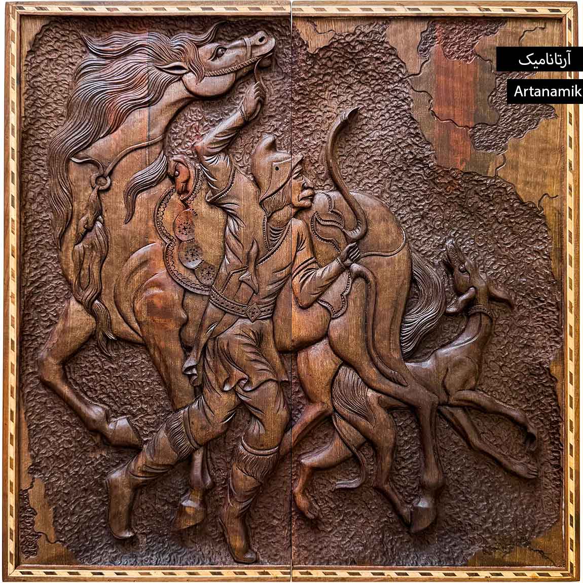 تخته نرد منبت کاری شده طرح شکارچی، اثری فاخر و چشمنواز است که هنر اصیل ایرانی را با جزئیات بینظیر در قالب یک بازی سنتی به نمایش میگذارد. این محصول از چوب گردوی کاملاً خشک و مرغوب ساخته شده و همین انتخاب باعث میشود در برابر تغییرات رطوبتی و جابهجایی مقاوم بوده و هیچگونه تاببرداشتگی در طول زمان نداشته باشد. سطح تخته با منبت کاری کاملاً دستساز تزئین شده و صحنهای از یک شکارچی با تیرکمان، افسار اسب در دست و سگی وفادار در کنارش را به تصویر میکشد؛ جزئیاتی که از یالهای اسب تا چکمههای شکارچی و قلاده سگ با دقتی مثالزدنی حکاکی شدهاند و جلوهای هنری و داستانی به این تخته نرد نفیس بخشیدهاند.