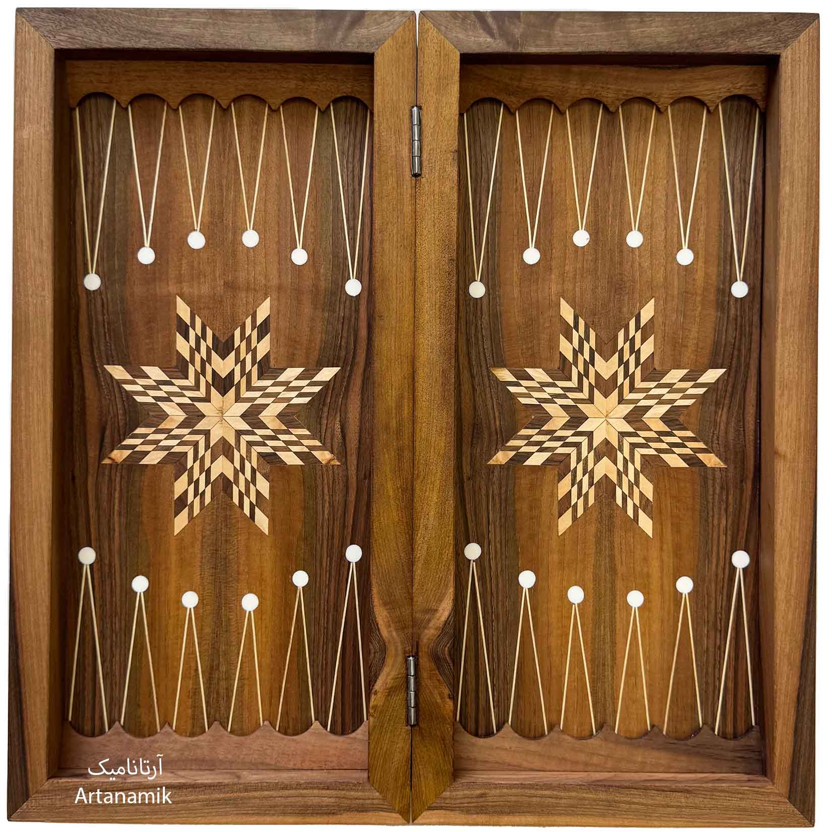 ابعاد این محصول در حالت باز، ابعاد استاندارد 50 در 50 سانتیمتر است؛ هرچند به دلیل سمبادهکاری دقیق کلافها، اندازه ممکن است بین 48 تا 50 سانتیمتر متغیر باشد. همراه محصول، مهرههای چوبی با کیفت، تاسها و کاور طرح گلیمی یا ترمه ارائه میشود تا تجربهای کامل و اصیل از بازی فراهم گردد. همچنین برای علاقهمندان به جلوهای لوکستر، امکان سفارش کیف طرح سامسونت وجود دارد که علاوه بر محافظت بیشتر و حمل آسانتر، حس پرمیوم بودن و ارزش کادویی محصول را دوچندان میکند.