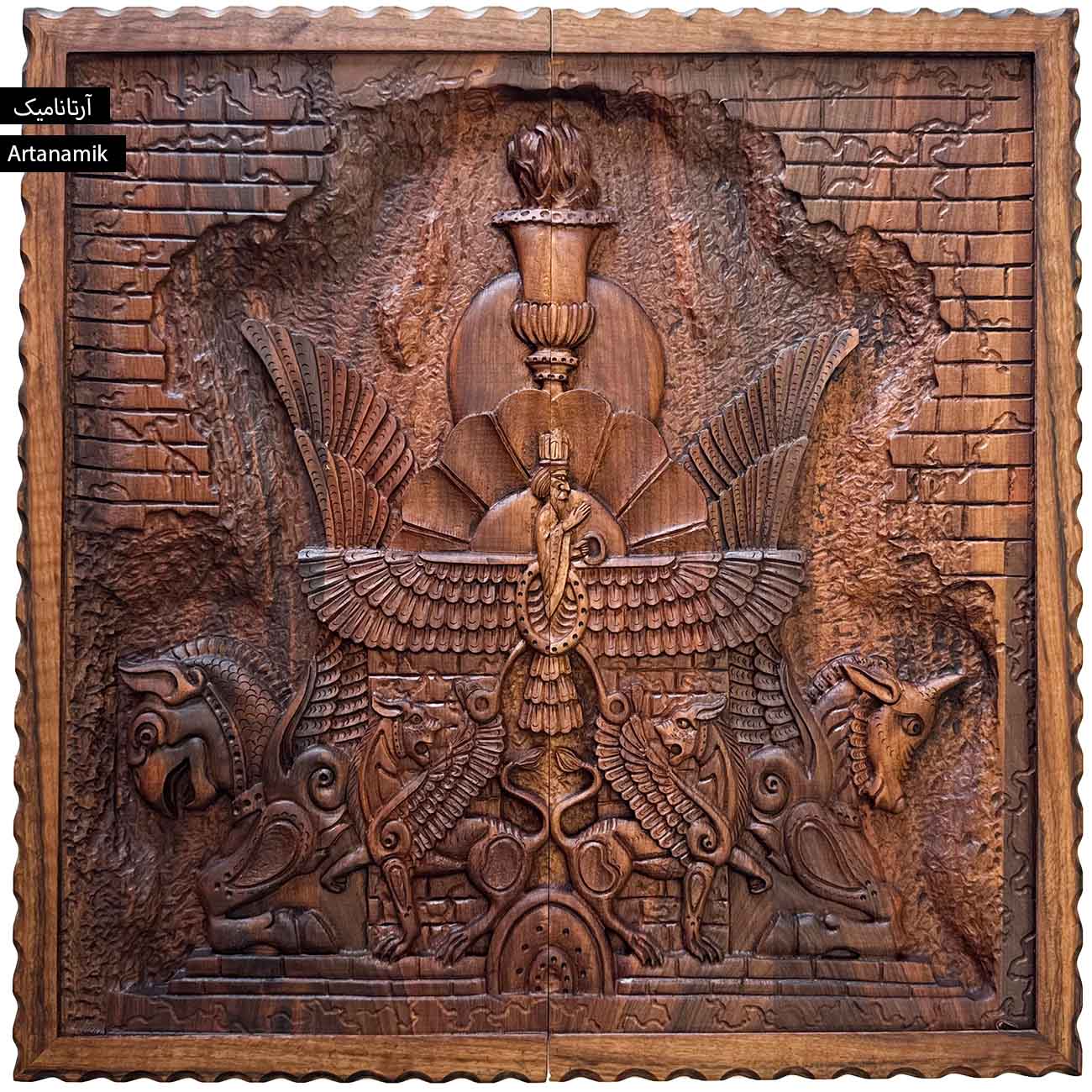 تخته نرد منبت کاری شده طرح آتشکده زرتشت، تنها یک وسیله برای بازی نیست، بلکه روایتگری است که افسانههای ایران باستان را بر پیکرهی چوب گردو زنده کرده است. وقتی به نمای بیرونی این اثر خیره میشوید، عظمت یک تاریخ را میبینید که با ظرافت دستان استادکار و تکنیک منبت عمیق، از دل چوب بیرون کشیده شده است. در مرکز این تابلوی چوبی، نمادی از اهورامزدا در کنار شعلههای جاودان قرار دارد که توسط دو شیر بالدار اساطیری (یادآور تندیسهای تخت جمشید و معماری هخامنشی) محافظت میشود. پسزمینهی این اثر با بافت آجریشکل و حاشیههایی که به صورت طبیعی و صخرهای تراش خوردهاند، حس قدمت و استحکام یک بنای باستانی را به بیننده القا میکند و همین جزئیات ریز است که ارزش خرید تخته نرد با این سطح از کیفیت را برای کلکسیونرها و عاشقان هنر دوچندان میکند.