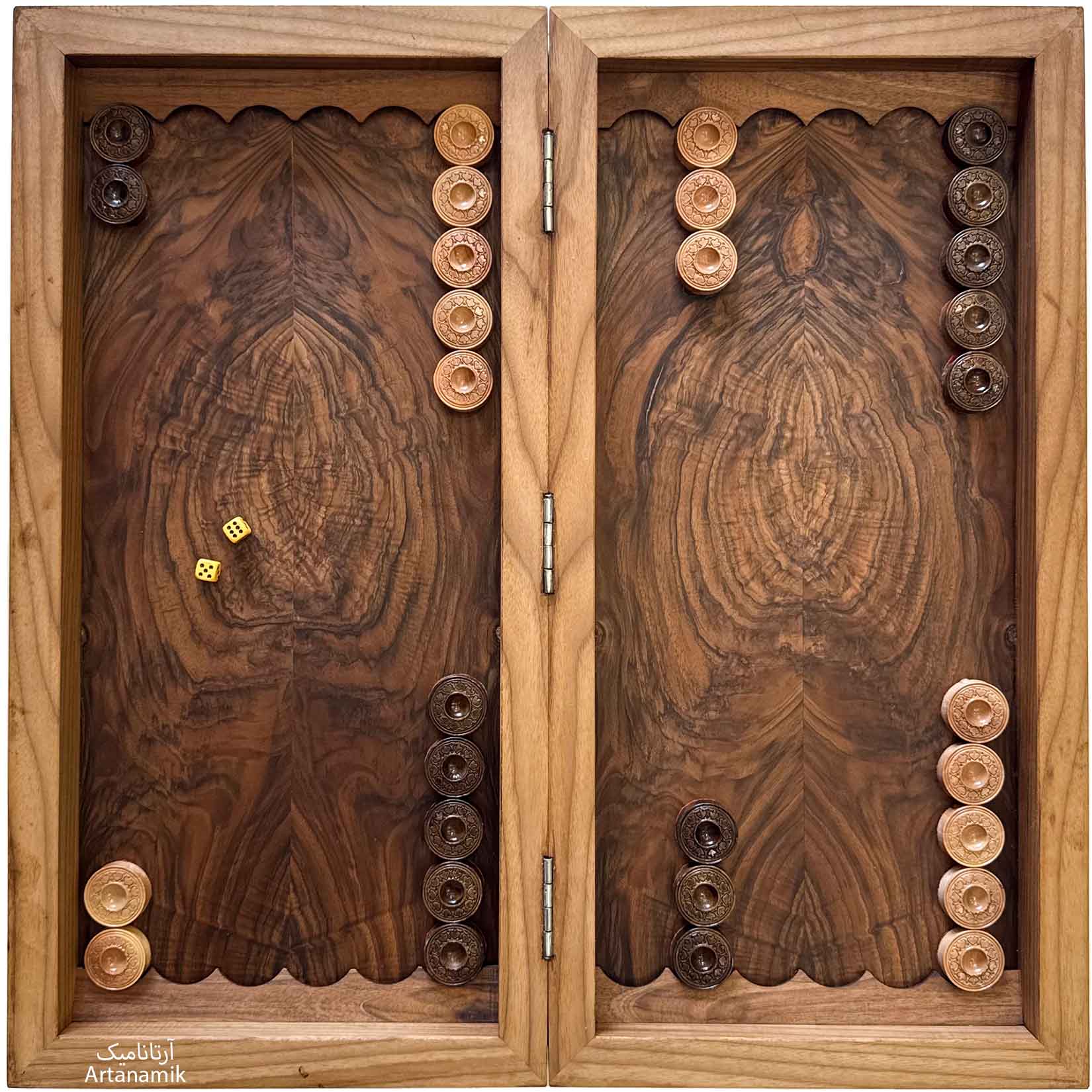 چیزی که این محصول را از تمام نمونههای موجود در بازار متمایز میکند، روح زندهای است که در کالبد آن دمیده شده. این تخته نرد با ابعاد بزرگ تر و اعیانی ۶0 در ۶0 سانتیمتر (در حالت باز)، تماماً از چوب گردوی کاملاً خشک شده ساخته شده است؛ فرآیند خشک شدن کامل چوب تضمین میکند که این اثر هنری سالهای سال بدون تابخوردگی یا ترک، اصالت خود را حفظ کند. اما جادوی اصلی در تکرارناپذیری آن نهفته است. از آنجا که طرح داخلی این اثر بر بستر ریشه گردو نقش بسته و ما با یک متریال کاملاً طبیعی روبرو هستیم، بازی رگهها و گرههای چوب در هر اثر منحصربهفرد است. شما با داشتن این کالا، صاحب اثری هستید که هیچ نمونهی دومی در جهان ندارد؛ چرا که طبیعت هیچگاه امضای خود را (رگههای چوب) دو بار تکرار نمیکند و این تخته نرد کادویی تا ابد خاص و تک باقی میماند.